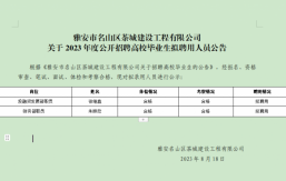 雅安市名山區(qū)茶城建設(shè)工程有限公司系雅安市名山區(qū)區(qū)屬一級(jí)國有企業(yè),成立于2018年10月,注冊(cè)資本金25000萬元,主要經(jīng)營范圍為對(duì)土地、城市資源等領(lǐng)域及保障性住房、房地產(chǎn)開發(fā)、城市基礎(chǔ)設(shè)施、公共服務(wù)設(shè)施等進(jìn)行經(jīng)營管理;并開展項(xiàng)目投資、工程管理服務(wù)、園林綠化、環(huán)境治理工程、土地整理和各類工程建設(shè)活動(dòng)等。根據(jù)公司2023年人員招聘計(jì)劃,茶城公司擬面向社會(huì)公開招聘3名工作人員。現(xiàn)將有關(guān)事項(xiàng)公告如下:一、報(bào)名條件(一)招錄崗位、名額及招錄資格條件(見附表)(二)基本條件1.本科及以上學(xué)歷、學(xué)士及以上學(xué)位。包括2023年應(yīng)屆高校畢業(yè)生;2022年、2021年未參加工...