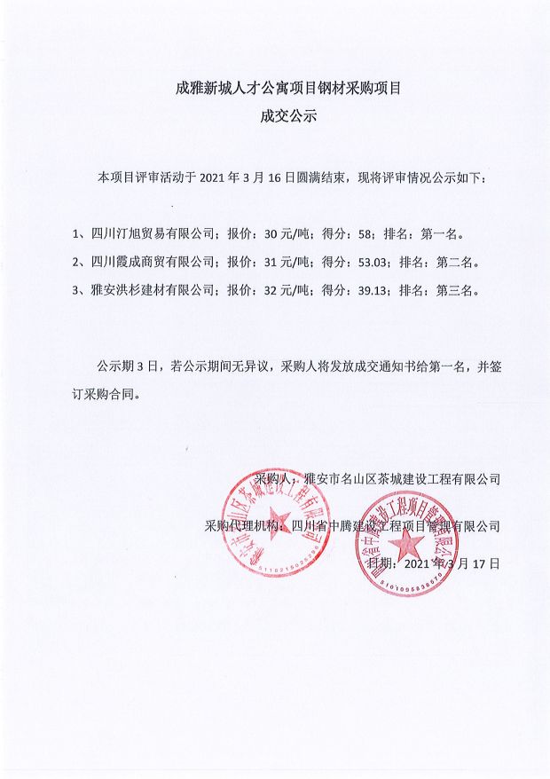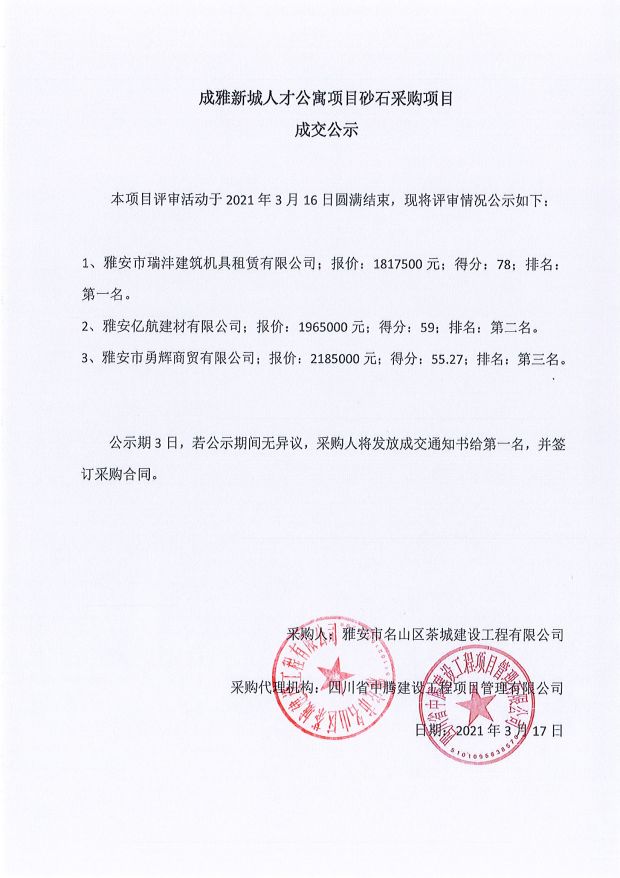 成雅新城人才公寓砂石、塔機(jī)租賃、土石方、鋼材、管架租賃、模板木方、水泥采購項目成交公示